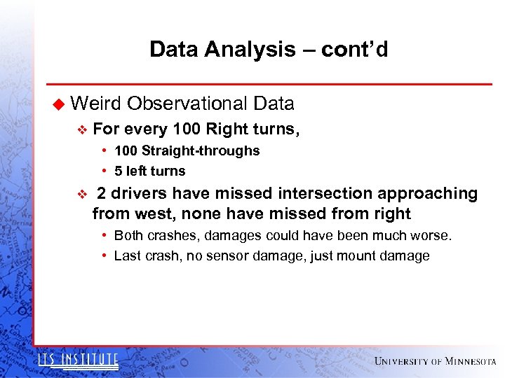 Data Analysis – cont’d u Weird v Observational Data For every 100 Right turns, • 100 Straight-throughs • 5 left turns v 2 drivers have missed intersection approaching from west, none have missed from right • Both crashes, damages could have been much worse. • Last crash, no sensor damage, just mount damage
