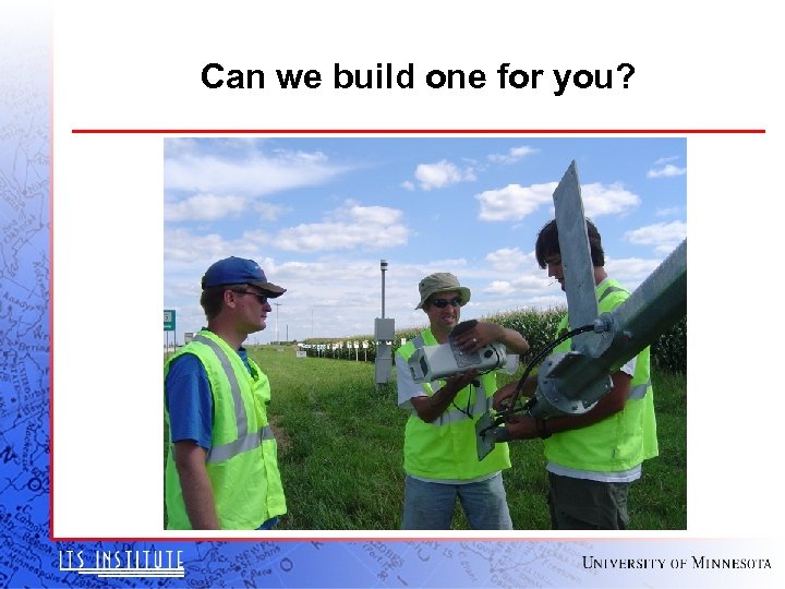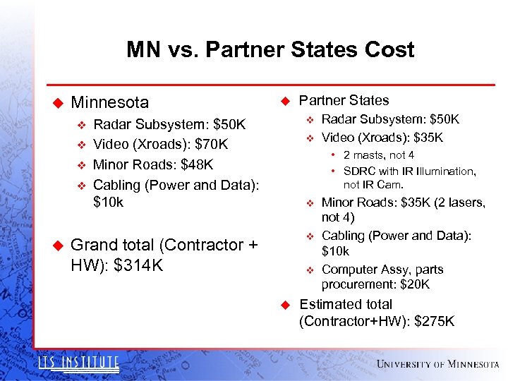 MN vs. Partner States Cost u Minnesota Partner States Radar Subsystem: $50 K Video (Xroads): $70 K Minor Roads: $48 K Cabling (Power and Data): $10 k v Grand total (Contractor + HW): $314 K v v v u u v Radar Subsystem: $50 K Video (Xroads): $35 K • 2 masts, not 4 • SDRC with IR Illumination, not IR Cam. v v u Minor Roads: $35 K (2 lasers, not 4) Cabling (Power and Data): $10 k Computer Assy, parts procurement: $20 K Estimated total (Contractor+HW): $275 K
