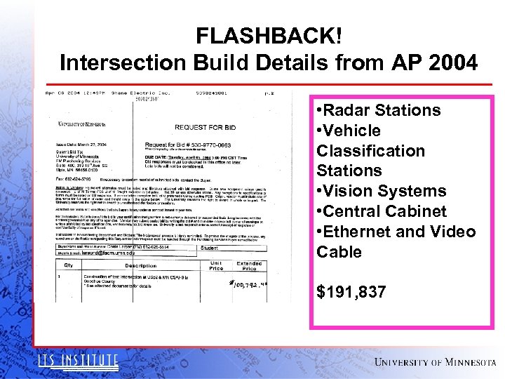 FLASHBACK! Intersection Build Details from AP 2004 • Radar Stations • Vehicle Classification Stations • Vision Systems • Central Cabinet • Ethernet and Video Cable $191, 837