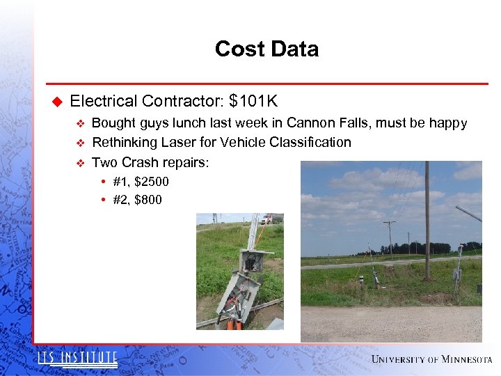 Cost Data u Electrical Contractor: $101 K v v v Bought guys lunch last week in Cannon Falls, must be happy Rethinking Laser for Vehicle Classification Two Crash repairs: • #1, $2500 • #2, $800