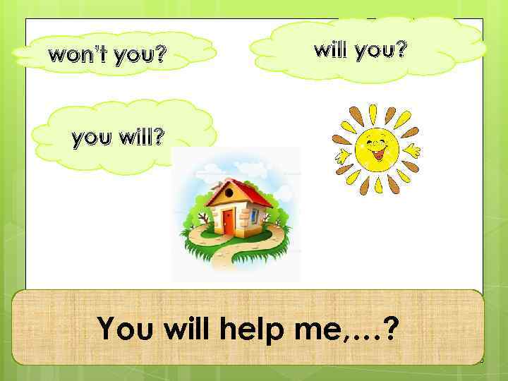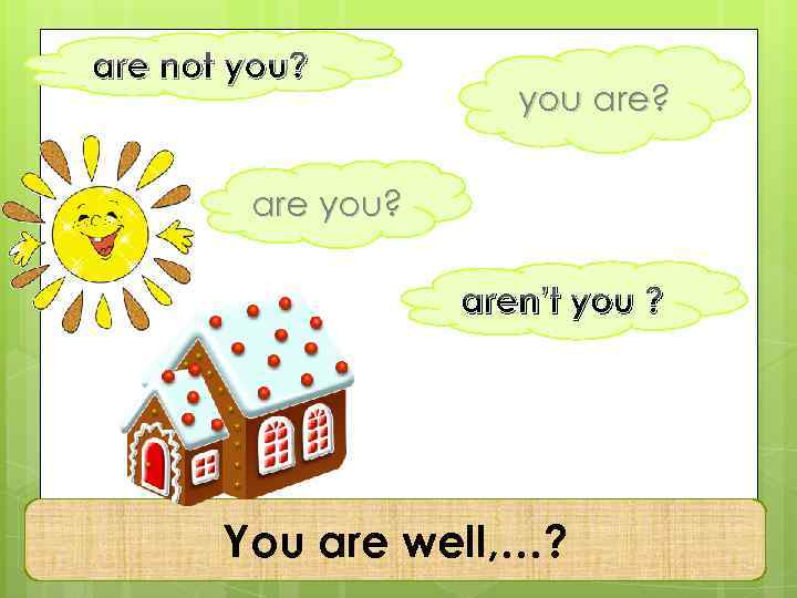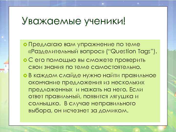 Уважаемые ученики! Предлагаю вам упражнение по теме «Разделительный вопрос» (“Question Tags”). С его помощью вы сможете проверить свои знания по теме самостоятельно. В каждом слайде нужно найти правильное окончание предложения из нескольких предложенных и нажать на него. Если ответ правильный, появится лягушка и солнышко. В случае неправильного выбора, он исчезнет за домиком.