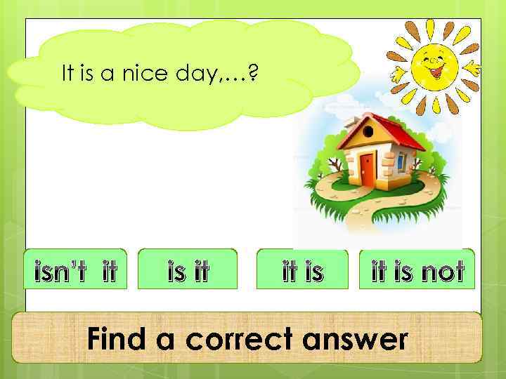 It is a nice day, …? isn’t it is not Find a correct answer