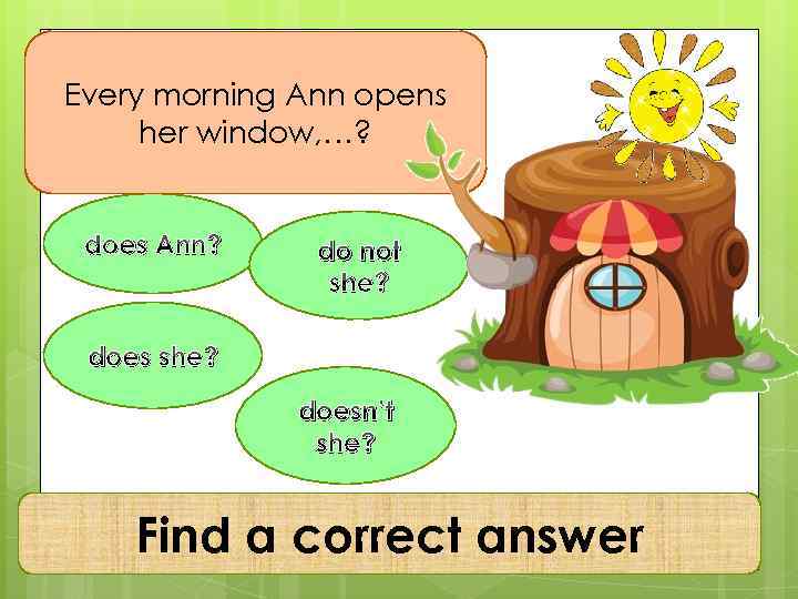 Every morning Ann opens her window, …? does Ann? do not she? does she? doesn’t she? Find a correct answer