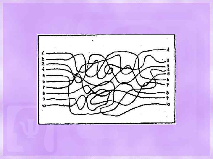 Цель: методика, направленная на проверку устойчивости внимания Возраст: для детей 6 -7 ми лет Методические рекомендации: Ребенку предлагается бланк с переплетенными линиями. Начало каждой линии имеет номер слева. А концы линий пронумерованы справа, номера начала и конца одной и той же линии не совпадают. Ребенку предлагают проследить по порядку все линии глазами, без помощи рук и найти конец каждой линии. При этом вслух называть номер начала линии и ее конца. Необходимо фиксировать время, затраченное на весь тест, а так же остановки, ошибки. На все задание отводится не более 4 -х минут.