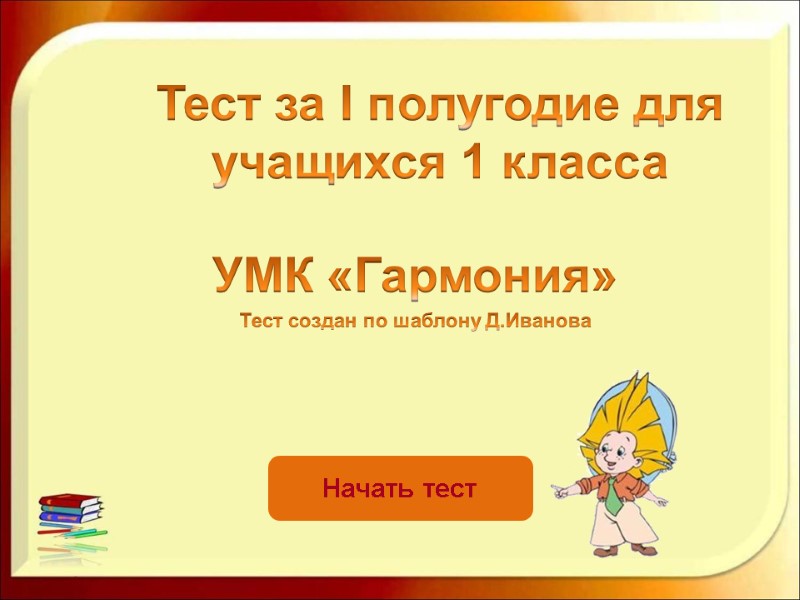 Тест за I полугодие для учащихся 1 класса УМК «Гармония» Тест создан по шаблону Д.Иванова Начать тест