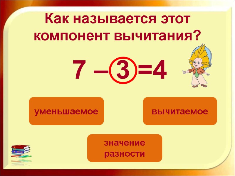 Как называется этот компонент вычитания? 7 – 3 =4 вычитаемое уменьшаемое значение разности