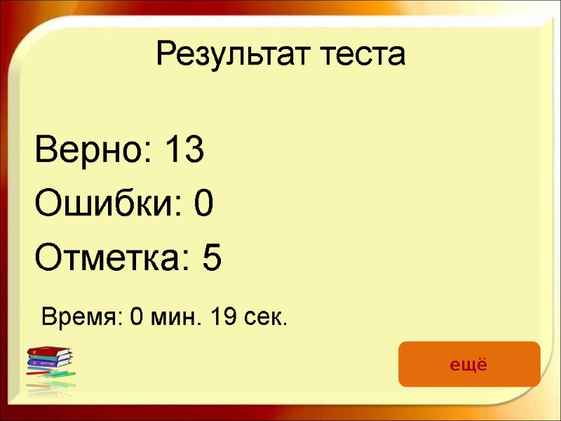 Результат теста Верно: 13 Ошибки: 0 Отметка: 5 Время: 0 мин. 19 сек. ещё исправить