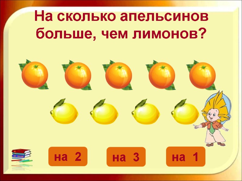 На сколько апельсинов больше, чем лимонов? на 1 на 2 на 3