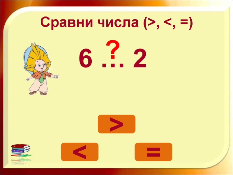 Сравни числа (>, <, =) 6 … 2 > < = ?