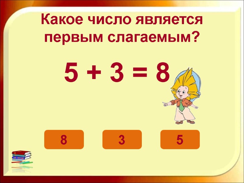 Какое число является первым слагаемым? 5 + 3 = 8 5 8 3