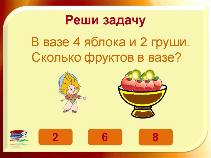 Реши задачу В вазе 4 яблока и 2 груши. Сколько фруктов в вазе? 6 2 8