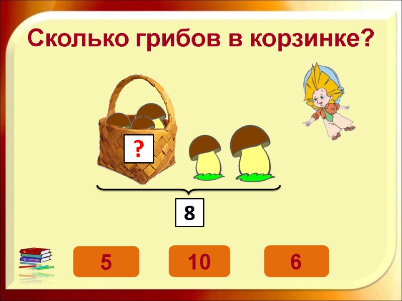 Сколько грибов в корзинке? 6 5 10 8 ?