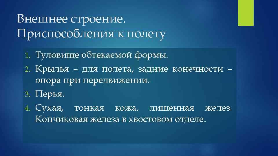 Внешнее строение. Приспособления к полету 1. Туловище обтекаемой формы. 2. Крылья – для полета, задние конечности – опора при передвижении. 3. Перья. 4. Сухая, тонкая кожа, лишенная желез. Копчиковая железа в хвостовом отделе.