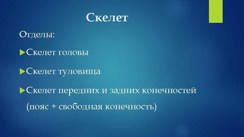 Скелет Отделы: Скелет головы Скелет туловища Скелет передних и задних конечностей (пояс + свободная конечность)