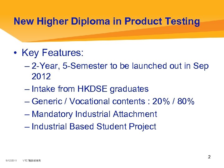 New Higher Diploma in Product Testing • Key Features: – 2 -Year, 5 -Semester to be launched out in Sep 2012 – Intake from HKDSE graduates – Generic / Vocational contents : 20% / 80% – Mandatory Industrial Attachment – Industrial Based Student Project 8/12/2011 VTC 職業訓練局 2