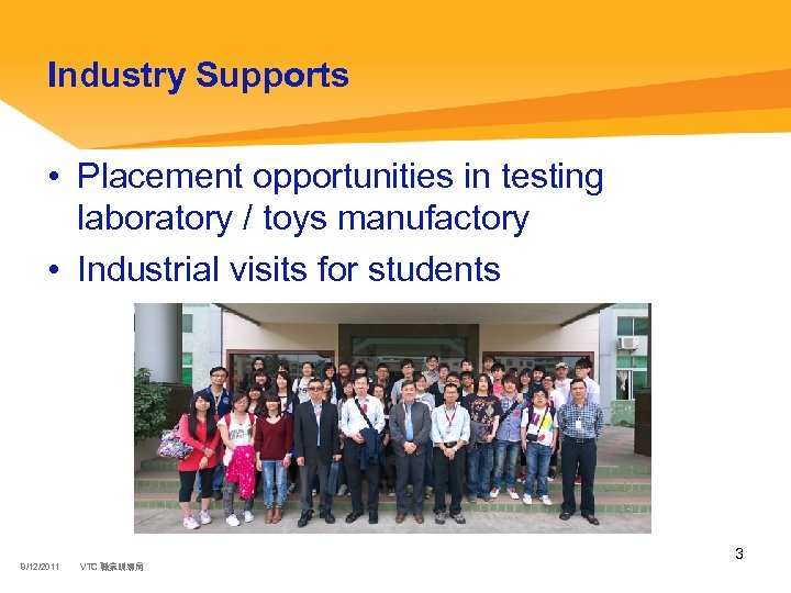Industry Supports • Placement opportunities in testing laboratory / toys manufactory • Industrial visits for students 8/12/2011 VTC 職業訓練局 3