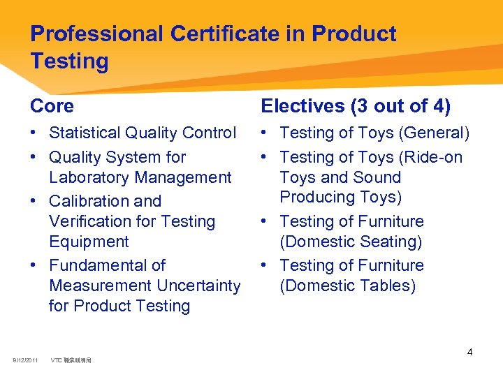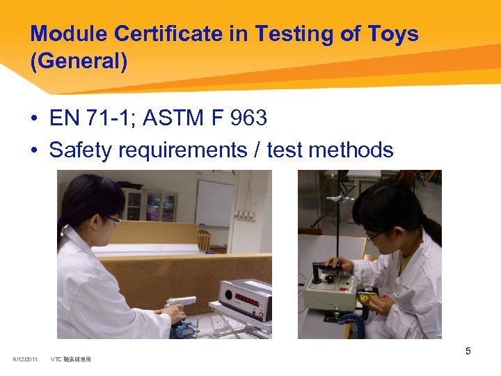 Professional Certificate in Product Testing Core Electives (3 out of 4) • Statistical Quality Control • Quality System for Laboratory Management • Calibration and Verification for Testing Equipment • Fundamental of Measurement Uncertainty for Product Testing • Testing of Toys (General) • Testing of Toys (Ride-on Toys and Sound Producing Toys) • Testing of Furniture (Domestic Seating) • Testing of Furniture (Domestic Tables) 8/12/2011 VTC 職業訓練局 4