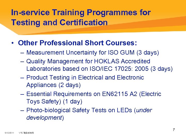 Module Certificate in Testing of Toys (Ride -on Toys and Sound Producing Toys) • EN 71 -1 ; ASTM F 963 • Safety requirements • Acoustic tests • Interpretation of test results 8/12/2011 VTC 職業訓練局 6