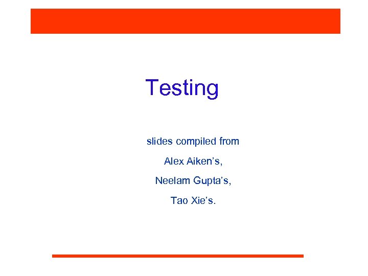 Testing slides compiled from Alex Aiken’s, Neelam Gupta’s, Tao Xie’s.