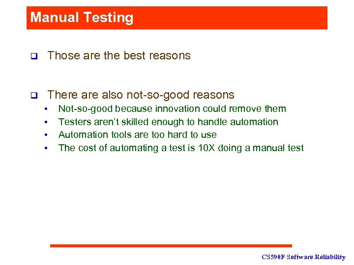 Manual Testing q Those are the best reasons q There also not-so-good reasons • • Not-so-good because innovation could remove them Testers aren’t skilled enough to handle automation Automation tools are too hard to use The cost of automating a test is 10 X doing a manual test CS 590 F Software Reliability