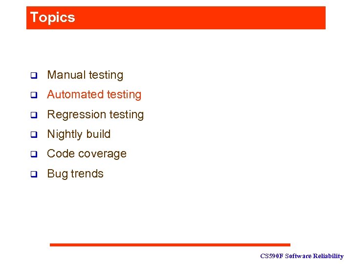 Topics q Manual testing q Automated testing q Regression testing q Nightly build q Code coverage q Bug trends CS 590 F Software Reliability