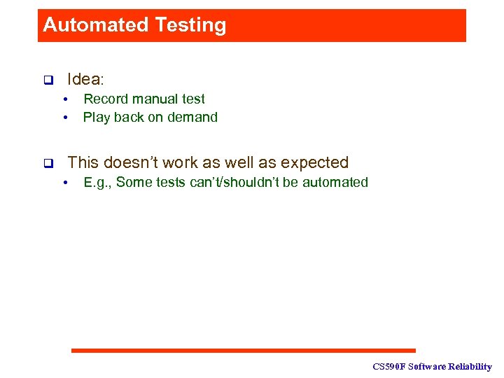 Automated Testing q Idea: • • q Record manual test Play back on demand This doesn’t work as well as expected • E. g. , Some tests can’t/shouldn’t be automated CS 590 F Software Reliability