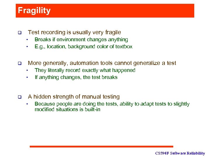 Fragility Test recording is usually very fragile q • • Breaks if environment changes anything E. g. , location, background color of textbox More generally, automation tools cannot generalize a test q • • They literally record exactly what happened If anything changes, the test breaks A hidden strength of manual testing q • Because people are doing the tests, ability to adapt tests to slightly modified situations is built-in CS 590 F Software Reliability
