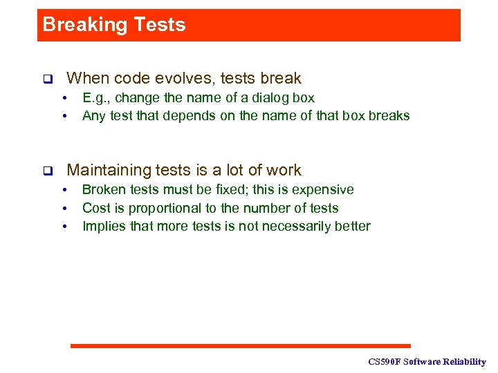 Breaking Tests q When code evolves, tests break • • q E. g. , change the name of a dialog box Any test that depends on the name of that box breaks Maintaining tests is a lot of work • • • Broken tests must be fixed; this is expensive Cost is proportional to the number of tests Implies that more tests is not necessarily better CS 590 F Software Reliability