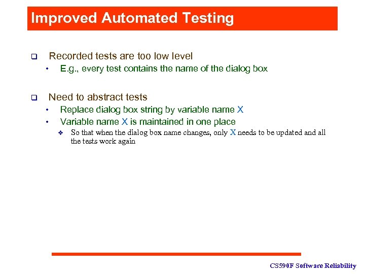 Improved Automated Testing Recorded tests are too low level q • E. g. , every test contains the name of the dialog box Need to abstract tests q • • Replace dialog box string by variable name X Variable name X is maintained in one place v So that when the dialog box name changes, only X needs to be updated and all the tests work again CS 590 F Software Reliability