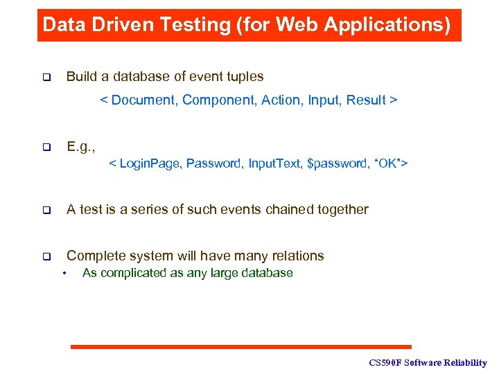 Data Driven Testing (for Web Applications) Build a database of event tuples q < Document, Component, Action, Input, Result > E. g. , q < Login. Page, Password, Input. Text, $password, “OK”> q A test is a series of such events chained together q Complete system will have many relations • As complicated as any large database CS 590 F Software Reliability