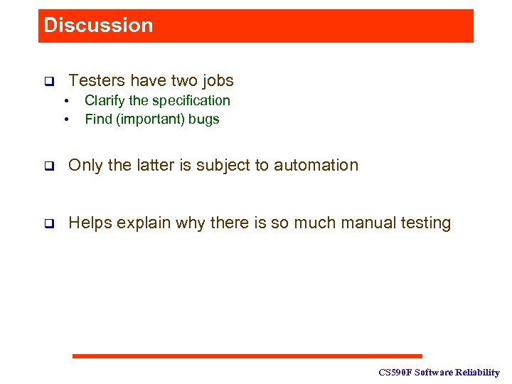 Discussion q Testers have two jobs • • Clarify the specification Find (important) bugs q Only the latter is subject to automation q Helps explain why there is so much manual testing CS 590 F Software Reliability