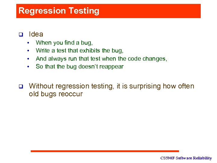 Regression Testing q Idea • • q When you find a bug, Write a test that exhibits the bug, And always run that test when the code changes, So that the bug doesn’t reappear Without regression testing, it is surprising how often old bugs reoccur CS 590 F Software Reliability