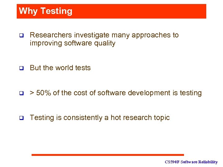Why Testing q Researchers investigate many approaches to improving software quality q But the world tests q > 50% of the cost of software development is testing q Testing is consistently a hot research topic CS 590 F Software Reliability