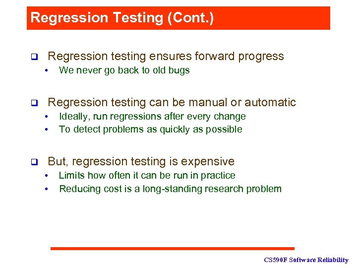 Regression Testing (Cont. ) q Regression testing ensures forward progress • q Regression testing can be manual or automatic • • q We never go back to old bugs Ideally, run regressions after every change To detect problems as quickly as possible But, regression testing is expensive • • Limits how often it can be run in practice Reducing cost is a long-standing research problem CS 590 F Software Reliability