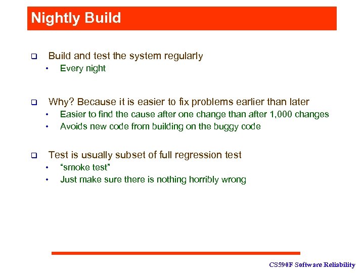 Nightly Build and test the system regularly q • Every night Why? Because it is easier to fix problems earlier than later q • • Easier to find the cause after one change than after 1, 000 changes Avoids new code from building on the buggy code Test is usually subset of full regression test q • • “smoke test” Just make sure there is nothing horribly wrong CS 590 F Software Reliability