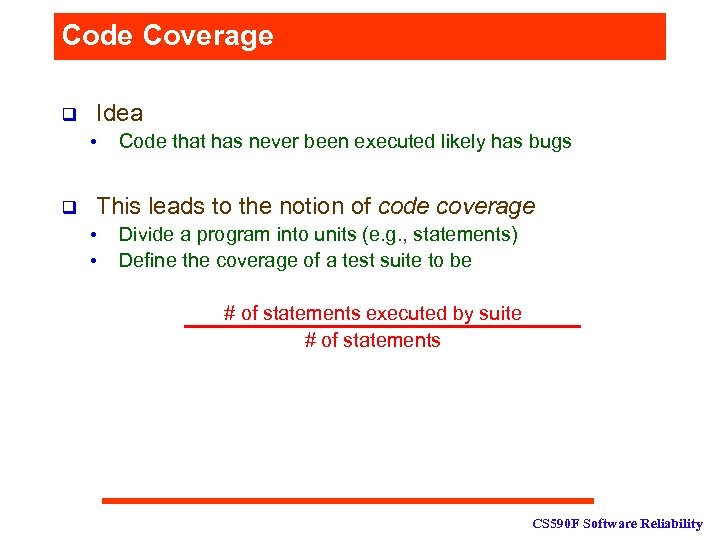 Code Coverage q Idea • q Code that has never been executed likely has bugs This leads to the notion of code coverage • • Divide a program into units (e. g. , statements) Define the coverage of a test suite to be # of statements executed by suite # of statements CS 590 F Software Reliability