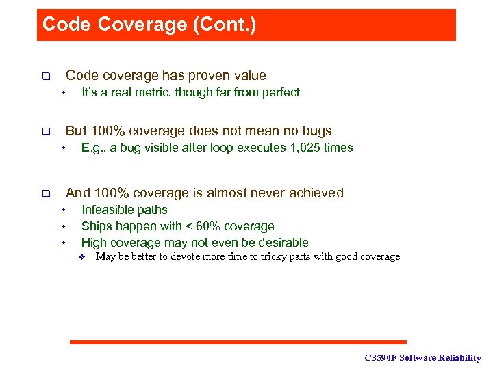 Code Coverage (Cont. ) Code coverage has proven value q • It’s a real metric, though far from perfect But 100% coverage does not mean no bugs q • E. g. , a bug visible after loop executes 1, 025 times And 100% coverage is almost never achieved q • • • Infeasible paths Ships happen with < 60% coverage High coverage may not even be desirable v May be better to devote more time to tricky parts with good coverage CS 590 F Software Reliability