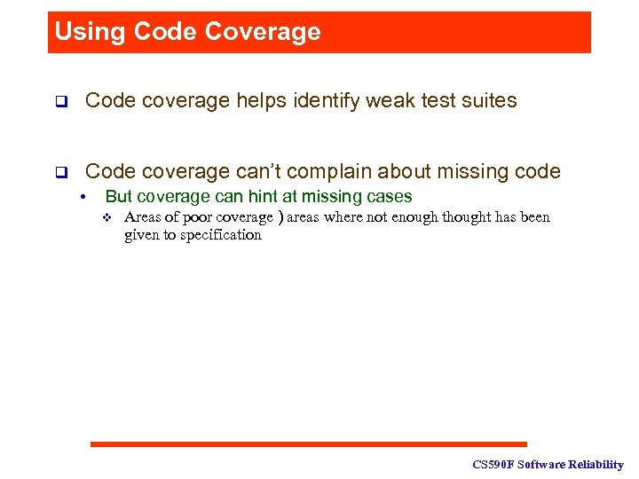 Using Code Coverage q Code coverage helps identify weak test suites q Code coverage can’t complain about missing code • But coverage can hint at missing cases v Areas of poor coverage ) areas where not enough thought has been given to specification CS 590 F Software Reliability