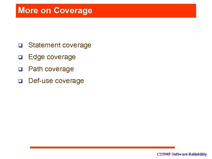 More on Coverage q Statement coverage q Edge coverage q Path coverage q Def-use coverage CS 590 F Software Reliability