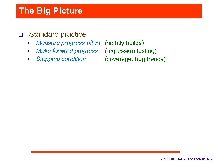 The Big Picture q Standard practice • • • Measure progress often (nightly builds) Make forward progress (regression testing) Stopping condition (coverage, bug trends) CS 590 F Software Reliability