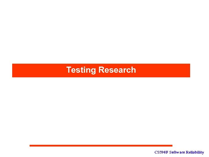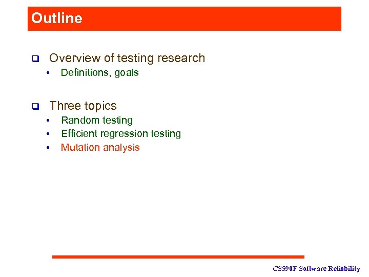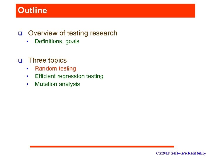 Outline q Overview of testing research • q Definitions, goals Three topics • • • Random testing Efficient regression testing Mutation analysis CS 590 F Software Reliability