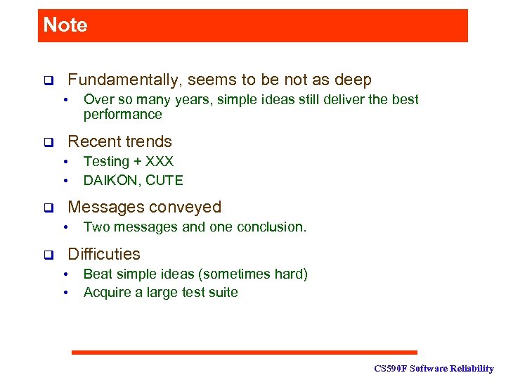 Note q Fundamentally, seems to be not as deep • q Recent trends • • q Testing + XXX DAIKON, CUTE Messages conveyed • q Over so many years, simple ideas still deliver the best performance Two messages and one conclusion. Difficuties • • Beat simple ideas (sometimes hard) Acquire a large test suite CS 590 F Software Reliability