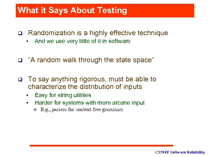 What it Says About Testing q Randomization is a highly effective technique • And we use very little of it in software q “A random walk through the state space” q To say anything rigorous, must be able to characterize the distribution of inputs • • Easy for string utilities Harder for systems with more arcane input v E. g. , parsers for context-free grammars CS 590 F Software Reliability