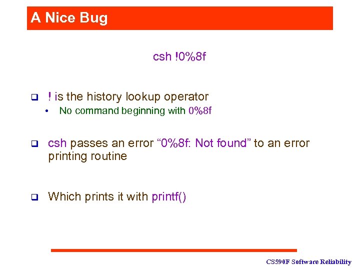 A Nice Bug csh !0%8 f q ! is the history lookup operator • No command beginning with 0%8 f q csh passes an error “ 0%8 f: Not found” to an error printing routine q Which prints it with printf() CS 590 F Software Reliability