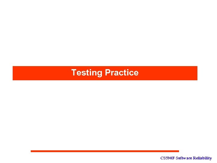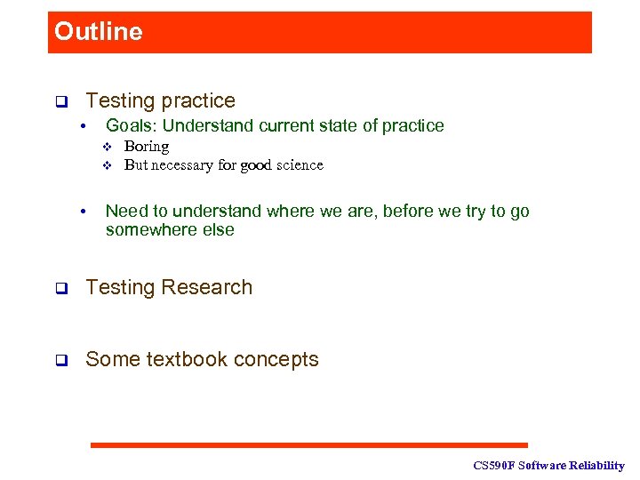 Outline q Testing practice • Goals: Understand current state of practice v v • Boring But necessary for good science Need to understand where we are, before we try to go somewhere else q Testing Research q Some textbook concepts CS 590 F Software Reliability