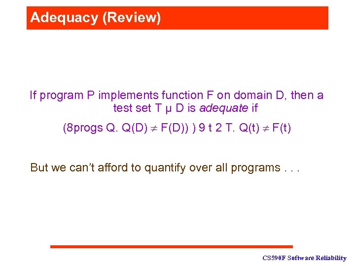 Adequacy (Review) If program P implements function F on domain D, then a test set T µ D is adequate if (8 progs Q. Q(D) ¹ F(D)) ) 9 t 2 T. Q(t) ¹ F(t) But we can’t afford to quantify over all programs. . . CS 590 F Software Reliability