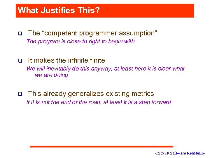 What Justifies This? q The “competent programmer assumption” The program is close to right to begin with q It makes the infinite We will inevitably do this anyway; at least here it is clear what we are doing q This already generalizes existing metrics If it is not the end of the road, at least it is a step forward CS 590 F Software Reliability
