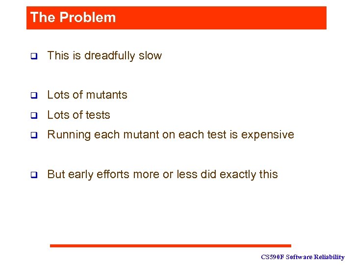 The Problem q This is dreadfully slow q Lots of mutants q Lots of tests q Running each mutant on each test is expensive q But early efforts more or less did exactly this CS 590 F Software Reliability