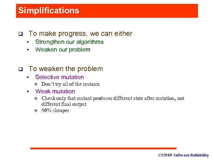 Simplifications q To make progress, we can either • • q Strengthen our algorithms Weaken our problem To weaken the problem • Selective mutation v • Don’t try all of the mutants Weak mutation v v Check only that mutant produces different state after mutation, not different final output 50% cheaper CS 590 F Software Reliability
