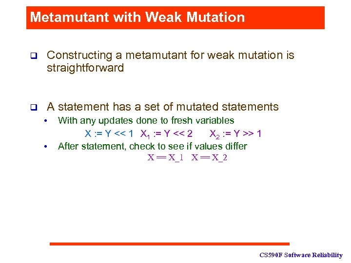 Metamutant with Weak Mutation q Constructing a metamutant for weak mutation is straightforward q A statement has a set of mutated statements • • With any updates done to fresh variables X : = Y << 1 X 1 : = Y << 2 X 2 : = Y >> 1 After statement, check to see if values differ X == X_1 X == X_2 CS 590 F Software Reliability